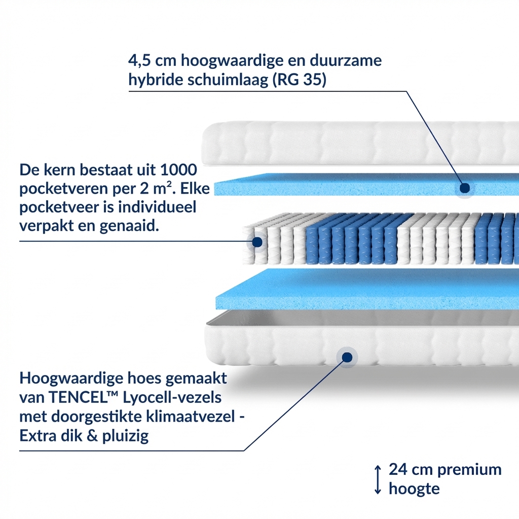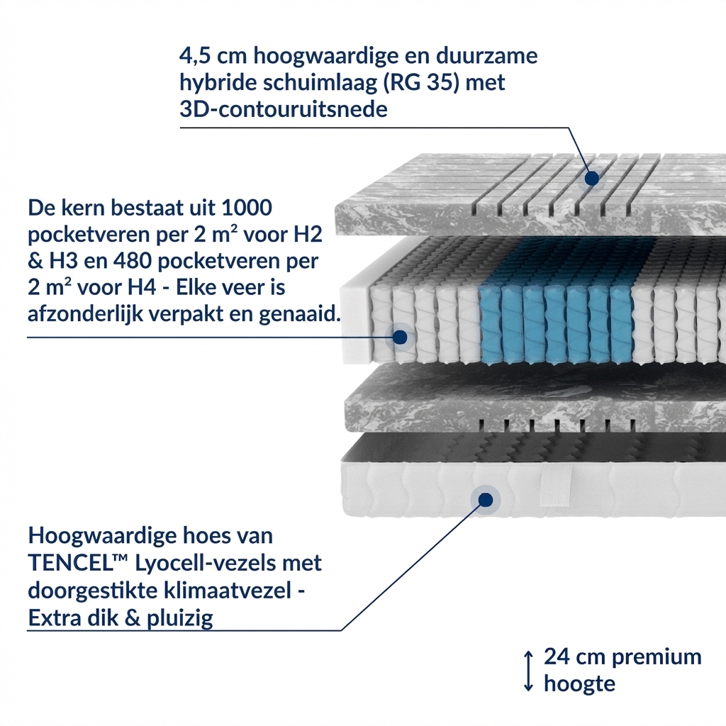 Deze matras combineert een duurzame pocketveren kern met hoogwaardig hybride schuim voor optimale puntelasticiteit en een aangenaam liggevoel..